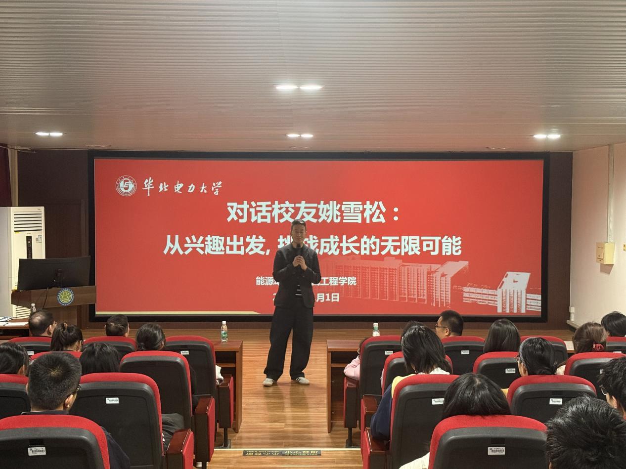 11月1日下午,能源动力与机械工程学院举办《对话校友姚雪松:从兴趣出发,挑战成长的无限可能》校友交流会,学院党委书记肖万里,副书记薛明磊、2025级本科生辅导员许暐玥和大一近百名同学共同参与活动,活动由学院团委书记张冬月主持。